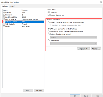 Player -> Manage -> Virtual Machine Settings에서 Network Adapter -> Network Connection에서 NAT로 설정한 후, Ok를 누른다.