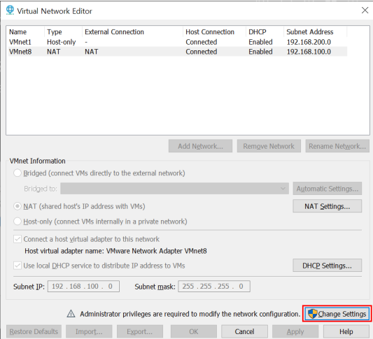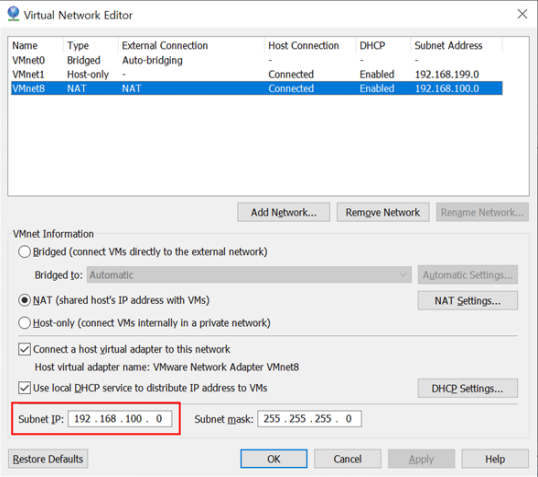 VMnet8의 NAT를 확인한 후, Subnet IP를 192.168.100.0으로 입력한다.