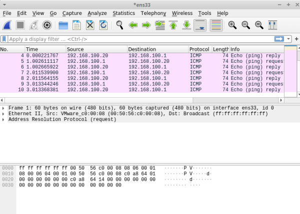 위의 명령으로 Wireshark를 실행해주고, ens33 네트워크 인터페이스를 선택한다.