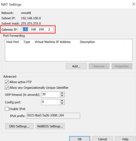 Subnet IP를 변경한 후, NAT Settings를 눌러 Gatway IP를 192.168.100.2로 변경한다.