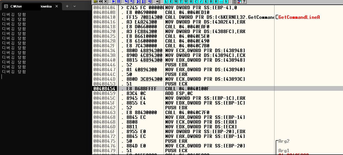 F8로 계속 진행하다보면 00408454을 진행했을 때 cmd창에 "디버깅 당함"이라는 문구가 출력된다.