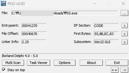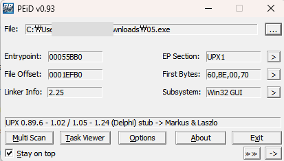 peid로 05.exe 파일을 살펴보면 패킹되어 있는 것을 알 수 있다.