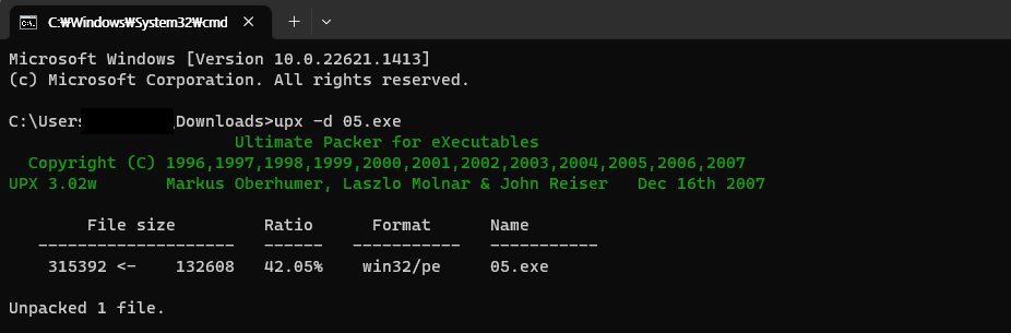 문제 파일을 upx가 있는 위치로 옮긴 후, upx -d 파일명.확장자로 언패킹 해준다.