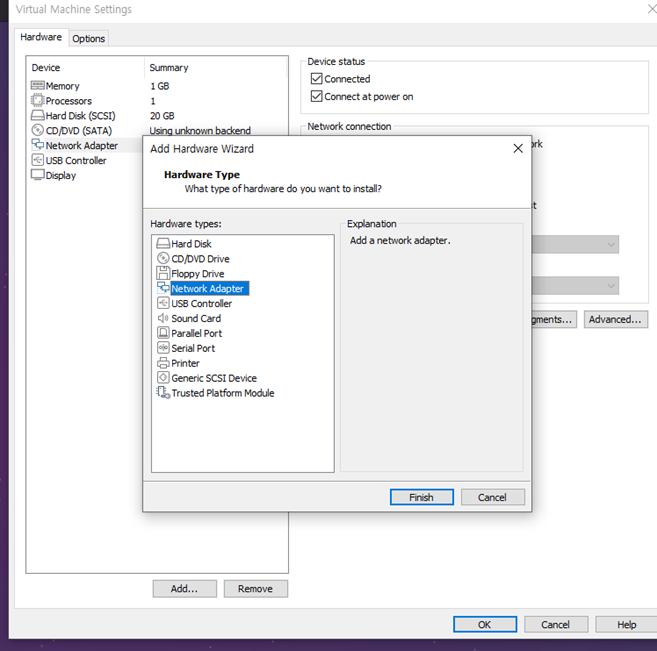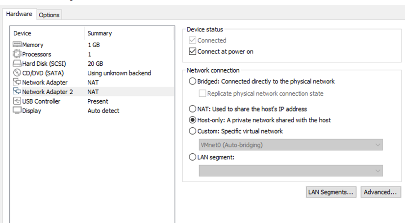 Adpater1은 NAT로, Adapter2는 Host-only로 설정해준다.