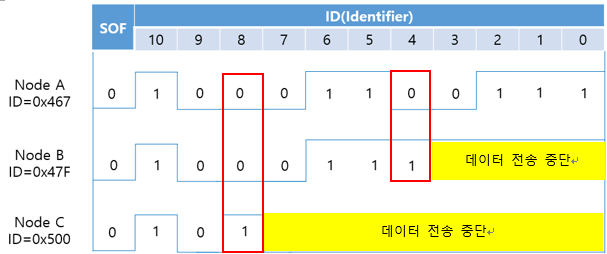 ③ 동시에 두 개 이상의 노드에서 메시지를 보내게 되어 충돌하게 될 경우, 두 메시지 중 우선순위가 높은(즉 CAN ID 값이 더 낮은) 메시지만 전송됨