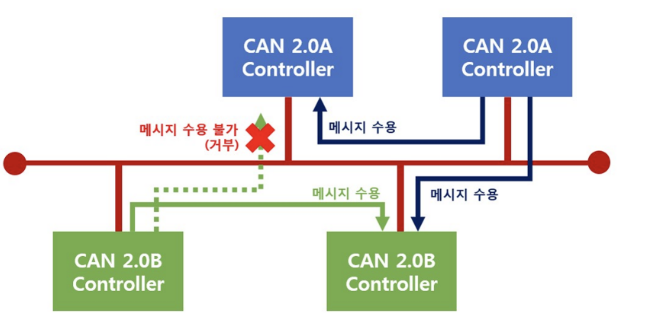 CAN 2.0A 컨트롤러는 오직 표준 CAN 포맷의 메시지만 전송 및 수신이 가능하며, 확장 CAN 포맷(CAN 2.0B)의 메시지를 수신하더라도 그 메시지를 무시함 => CAN 2.0A 컨트롤러에서 보내온 메시지 데이터만 유효합니다.