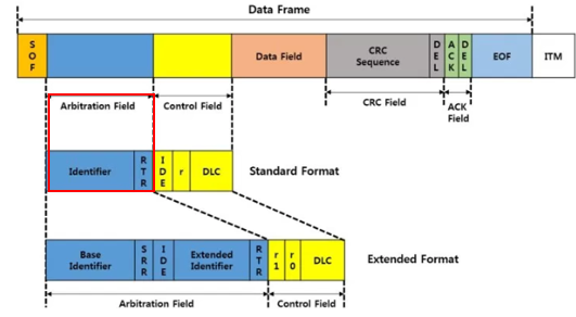 - CAN Message Format을 살펴보면 Arbitration Field에 Identifier(ID)값이 낮을수록 메시지의 우선순위가 높아지고 먼저 전송