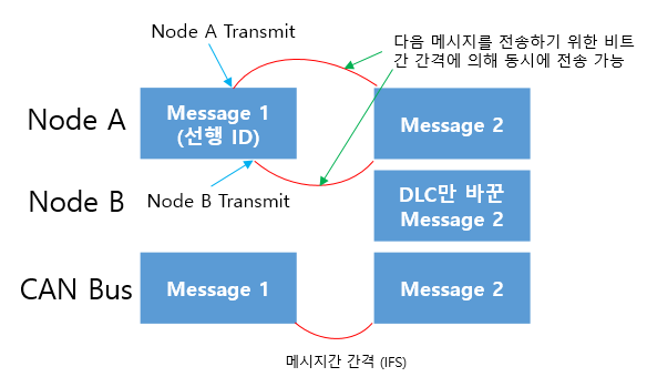 - 메시지 충돌 시 우선순위가 높은 메시지(이 때, 더 낮은 ID 번호가 더 높은 우선순위를 가짐)가 먼저 전송