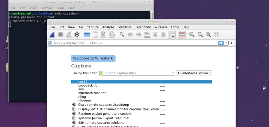 Xubuntu에서 와이어샤크를 실행하고 ens33을 선택한다.