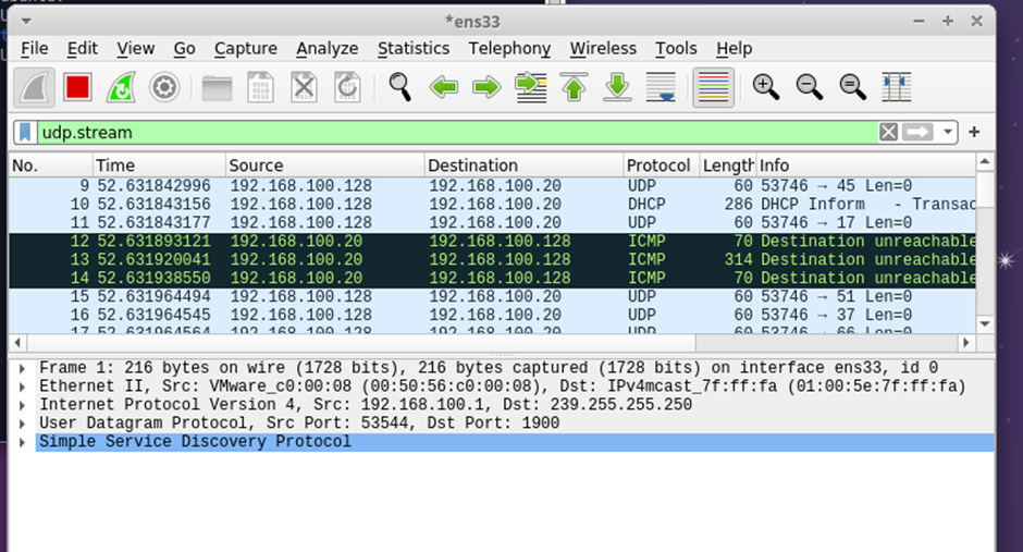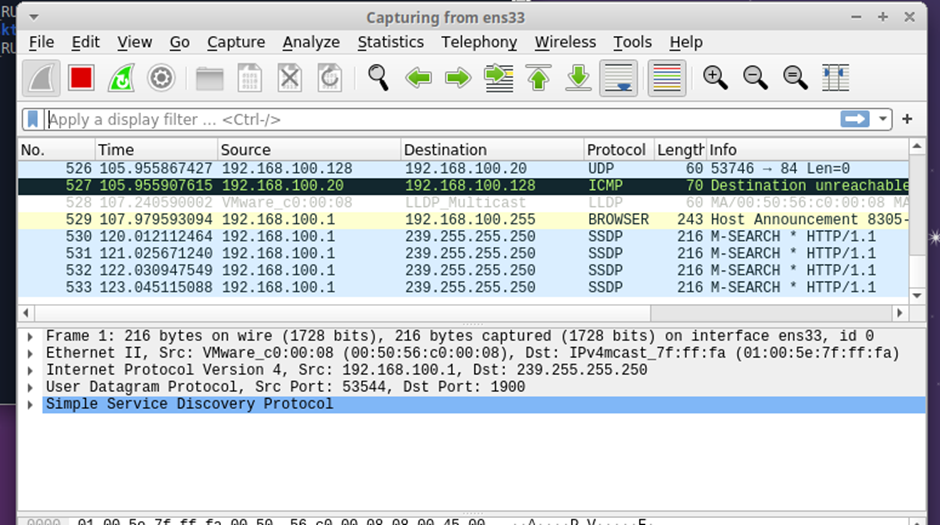 Xubuntu에서 실행한 와이어샤크를 확인하면 SSDP 패킷이 온 것을 확인할 수 있다.