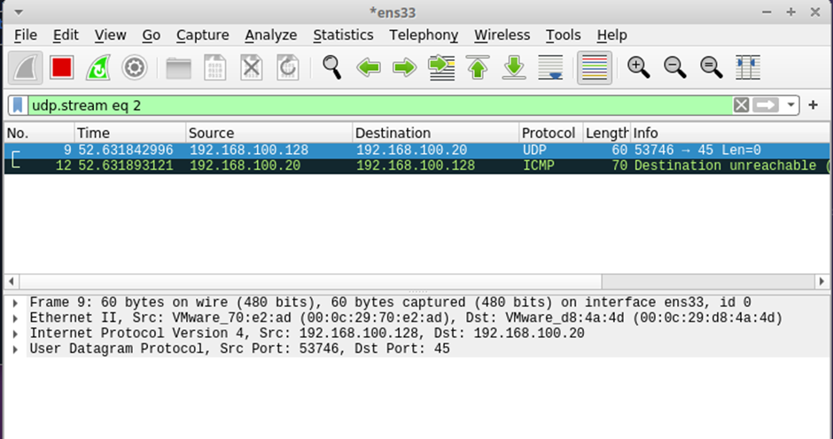 udp.stream eq 2 로 필터링 : 닫혀있는 포트 흐름을 확인한다.