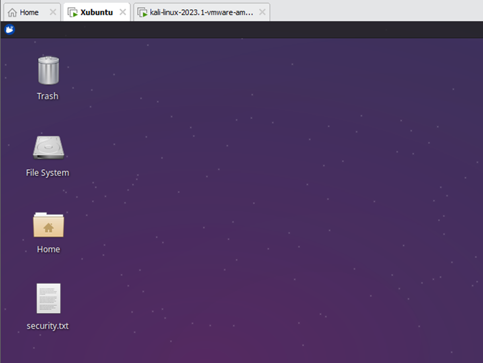 Xubuntu로 가보면 바탕화면에 security.txt 파일이 생성된 것을 확인할 수 있다.