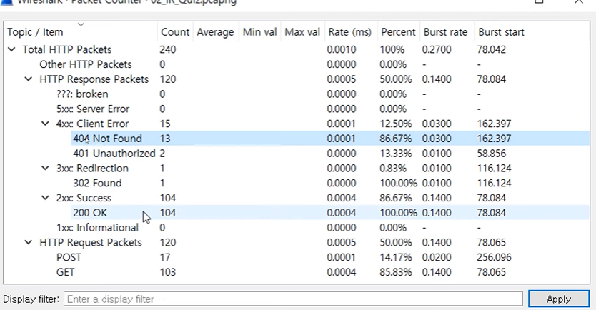 패킷 통계 보면 저번 사례와 마찬가지로 TCP 안의 HTTP가 많은 것을 확인할 수 있음