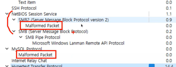 여기서 난독화가 발생되었거나 공격 패킷들이 안에 들어있는 경우, Malformed Packet으로 표시가 된다.