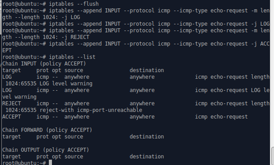ping을 보낸 후 Xubuntu에서 wireshark를 멈춰 패킷을 확인하면, icmp 패킷이 목적지에 도착하지 않았음을 확인할 수 있다.
