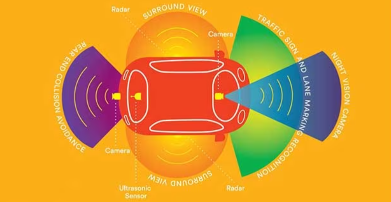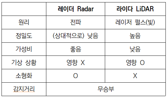 각각 전파와 레이저(빛) 펄스를 이용하여 대상과의 거리를 측정 = 어두운 환경에서도 확실한 성능을 가짐