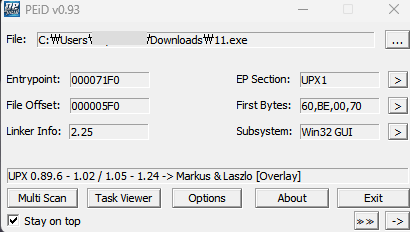 peid로 실행 파일을 확인해보니 upx로 패킹되어 있음을 알 수 있었다.