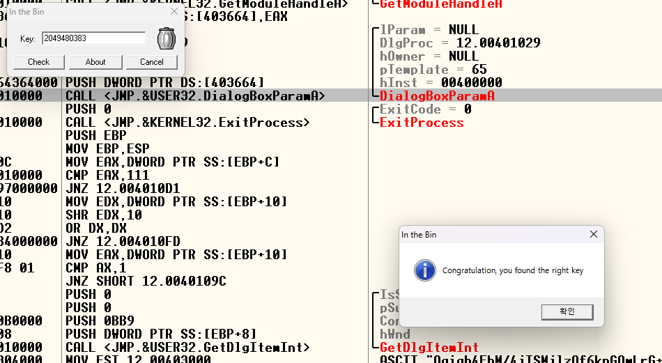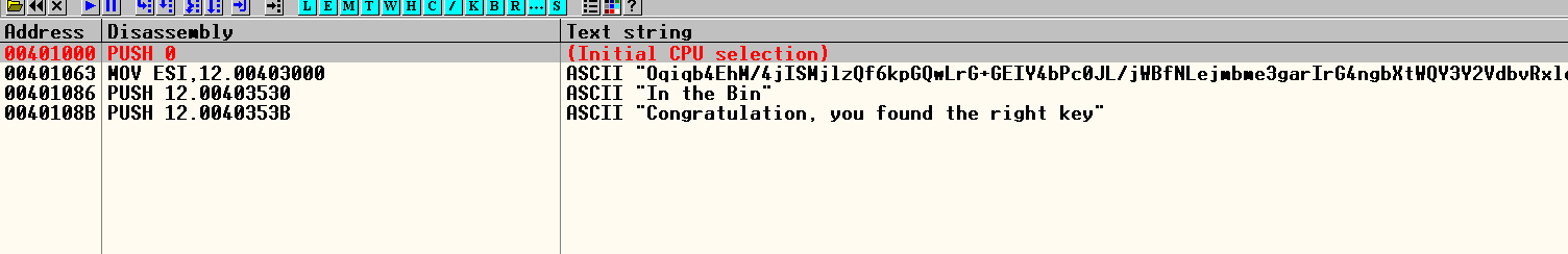 "Congratulation, you found the right key" 가 올바른 키를 입력했을 때 나오는 부분인 것 같으니 더블 클릭으로 이동해준다.