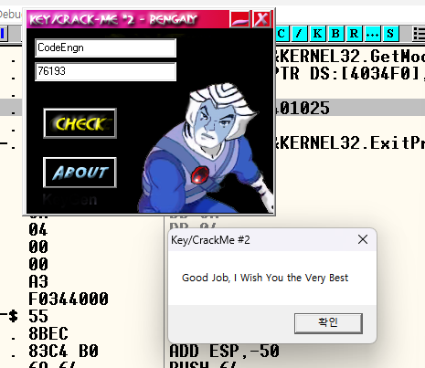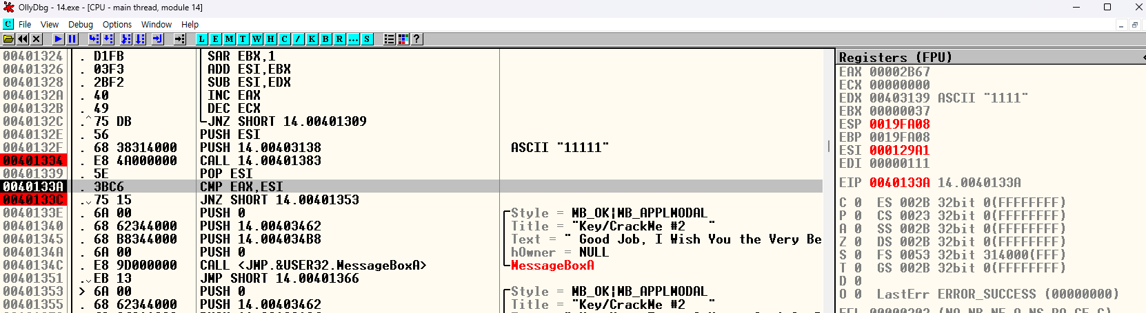 성공 메세지를 띄우는 MessageBoxA 전에 EAX와 ESI의 값을 비교해서 성공/실패 여부를 결정하는 구간을 발견했다.