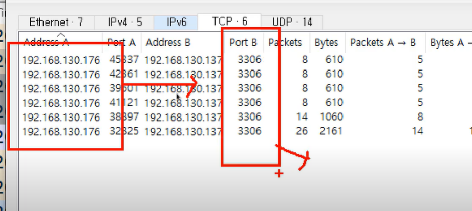conversations를 보니 192.168.130.176에서 3306(mysql 기본 포트)으로 전송된 것이 많은 것을 알 수 있다.