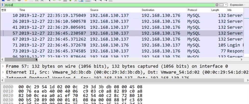 프로토콜 계층을 살펴보면 mysql 패킷임을 확인할 수 있다.