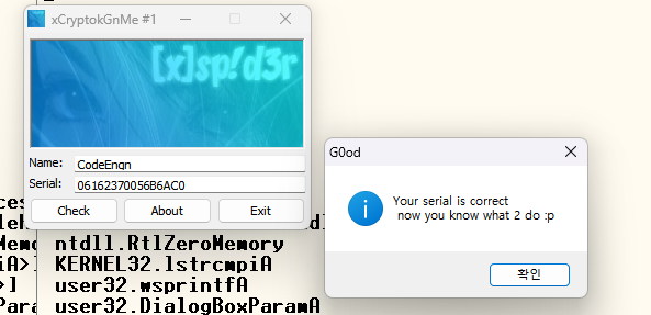 Name과 Serial을 입력해주고 Check를 누르고 실행하면 BP를 걸어준 곳으로 이동한다.