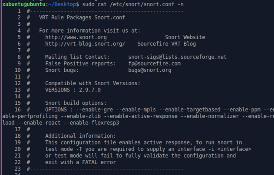 라인 번호를 포함하여 snort 설정 파일을 확인한다.