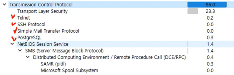 만약 brute force 공격이 이뤄졌다면, 아래쪽(빨간 박스 부분)에 테스트한 패킷들이 뜰텐데, 깨끗하다.