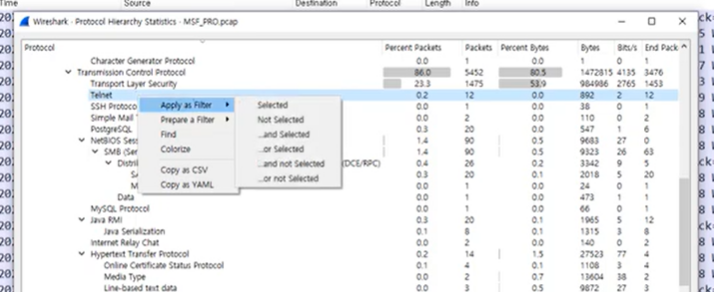 Protocol Hierachy에서 Telnet > Apply at Filter > Selected를 누르면,