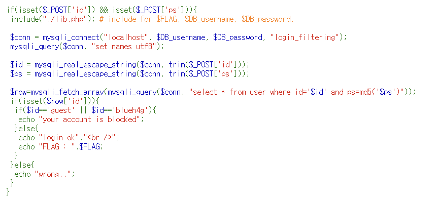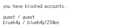 계정은 guest와 blueh4g의 막힌 계정 2개를 가지고 있고, guest와 blueh4g가 아니라면 플래그를 보여준다.