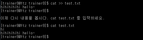 또, 리다이렉션을 두 번 사용하면, 텍스트 파일의 뒤에 새로운 내용을 추가할 수 있다.