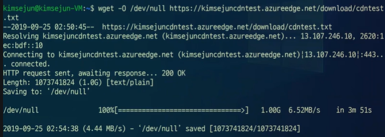 Azure CDN을 통해 한국 중부 Region에 있는 1GB를 다운로드 받는다.