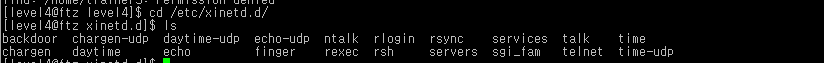 /etc/xinetd.d로 이동해서 ls 명령으로 파일/디렉토리를 확인해보니, backdoor라는 파일이 존재하는 것을 알 수 있었다.
