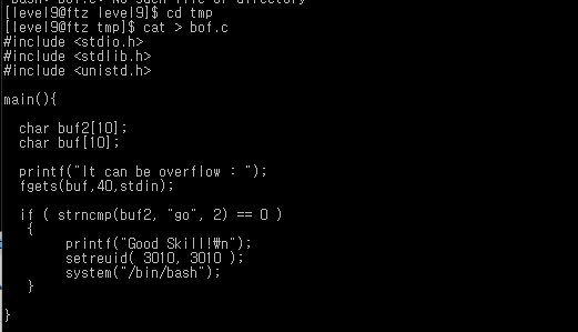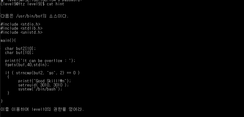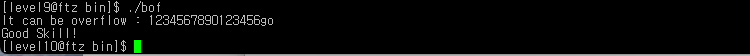 - buf2가 buf보다 먼저 선언되었으므로, buf의 입력값이 10 이상이면 buf2로 넘어간다. 이때, buf에 go를 입력하면 level10의 권한을 얻을 수 있다.