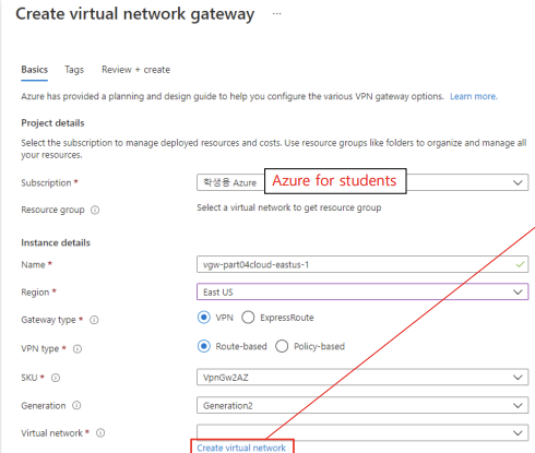 가상 게이트웨이(VGW)의 이름을 설정하고, Region을 East US로 설정해준다.