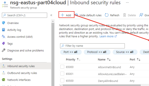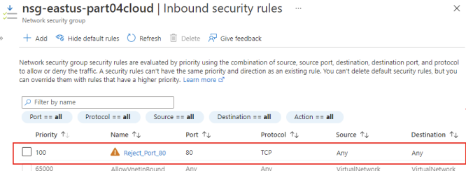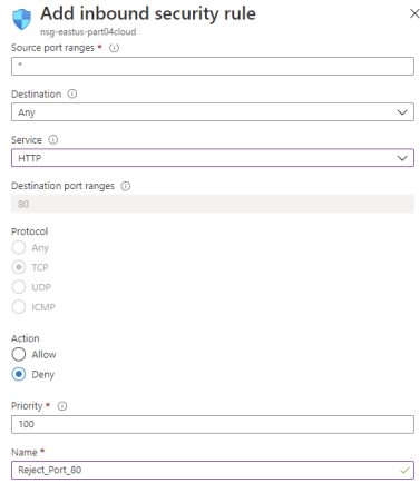nsg에서 add를 누르고, Service에서 HTTP를 선택하고 Action을 Deny로 설정해주면 된다.