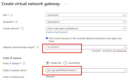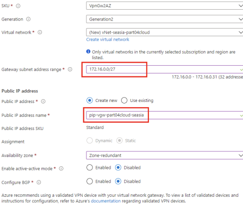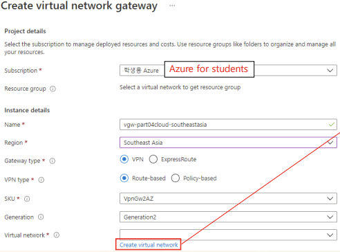 게이트웨이 서브넷 주소 범위를 27바이트로 설정해주고, public IP 주소 이름을 정해주고, 검토 후 생성 -> 만들기를 누르면 게이트웨이를 생성할 수 있다.