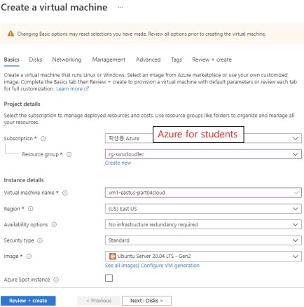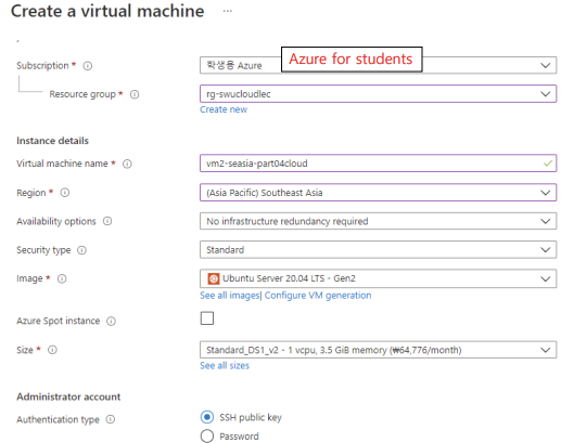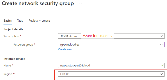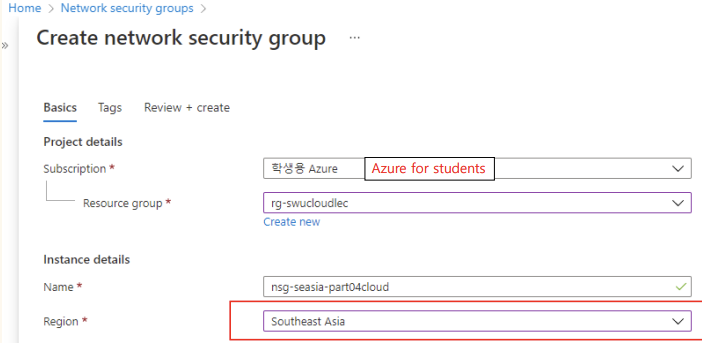 Southeast Asia도 East US와 동일한데, Region만 Southeast Asia로 설정해준다.