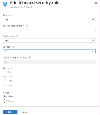 nsg에서 add > Service SSH 설정 후, Action을 Allow로 선택하면 SSH 연결을 허락할 수 있다.