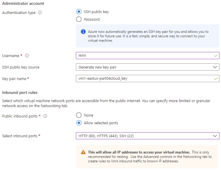 Region을 East US로 설정하고, Authentication type은 SSH public key로 설정한다.