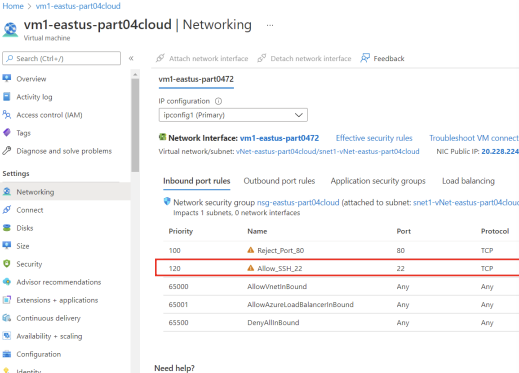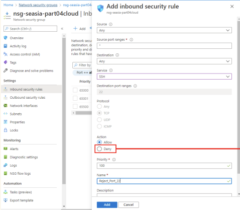 southeast asia의 nsg에서 add > service ssh 선택 후 action을 deny로 해주면 된다.