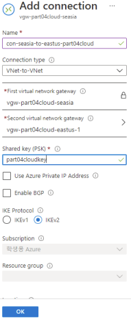 각 가상머신에 wget 명령을 통해 eastus에는 seast private ip를, seast에는 eastus의 private ip를 적어 연결해준다.