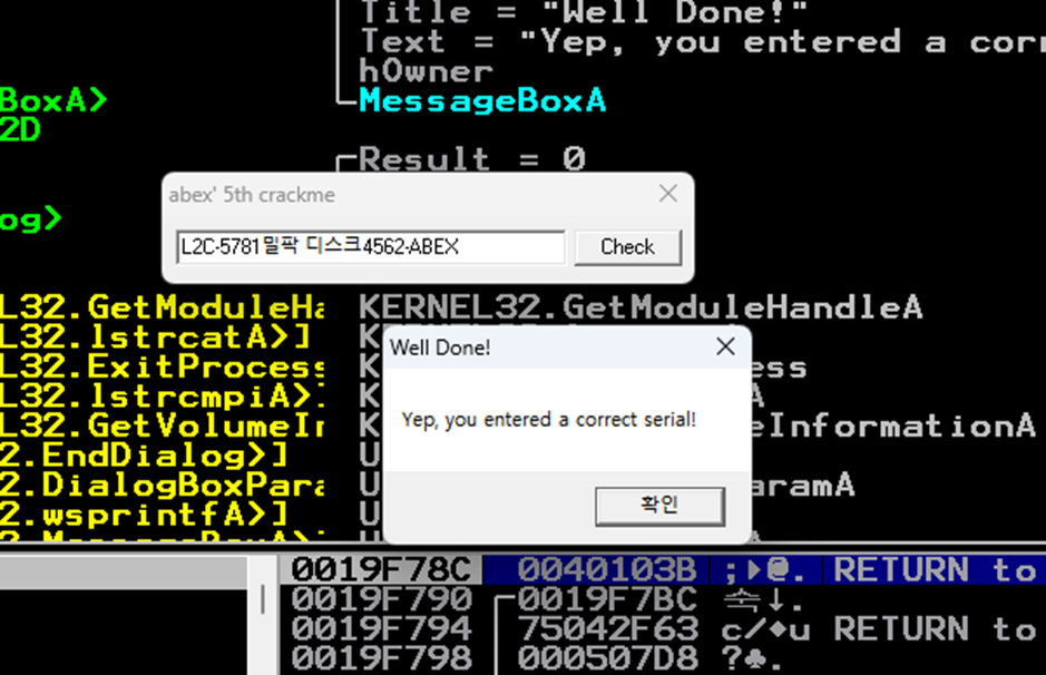 시리얼을 입력해보면, 올바른 시리얼임을 알 수 있다.