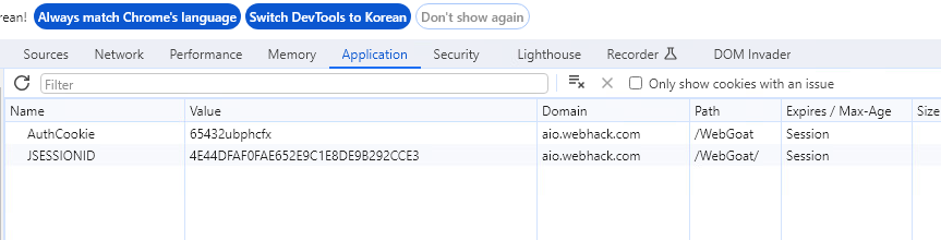 aspect나 webgoat 계정으로 로그인 후, 개발자 도구에서 AuthCookie 값을 alice의 쿠키 값으로 수정해주면 alice로 변경할 수 있다.