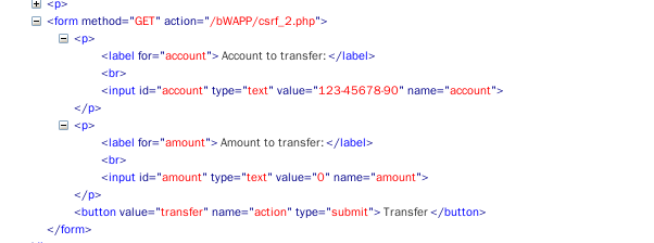 'csrf_2.php' 페이지의 개발자 도구에서 소스 코드를 확ㅇ니해 보면 소스 코드에 'account' 변수와 'amount' 변수가 노출되어 있다. => account 변수는 계좌번호, amount 변수는 이체할 금액