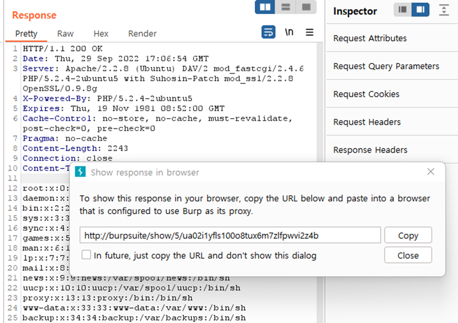 passwd 파일 안에 있는 내용을 웹브라우저에서도 출력한다. xxe-2.php 페이지는 직접 접근이 불가능한 페이지지만, 서버의 계정 정보를 출력함