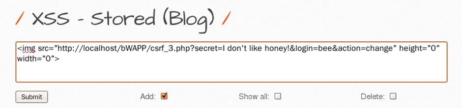 xss_stored_1.php 페이지에 이미지 태그를 이용해 다른 사용자의 아이디를 입력하여 비밀번호 힌트를 바꾸는 CSRF 공격 시도하는 코드를 입력한다.