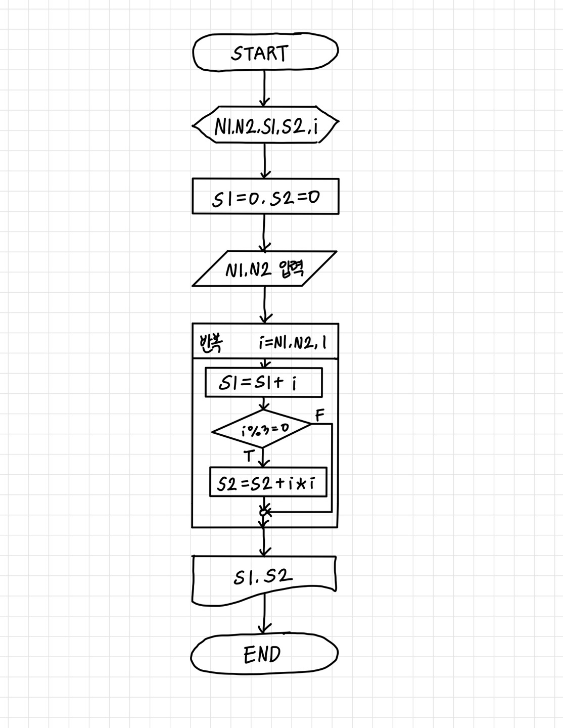문제 2) 서로 다른 자연수 2개를 받아들여 그 사이에 존재하는 자연수의 합과 3의 배수의 제곱의 합을 구하여 출력하는 알고리즘 순서도