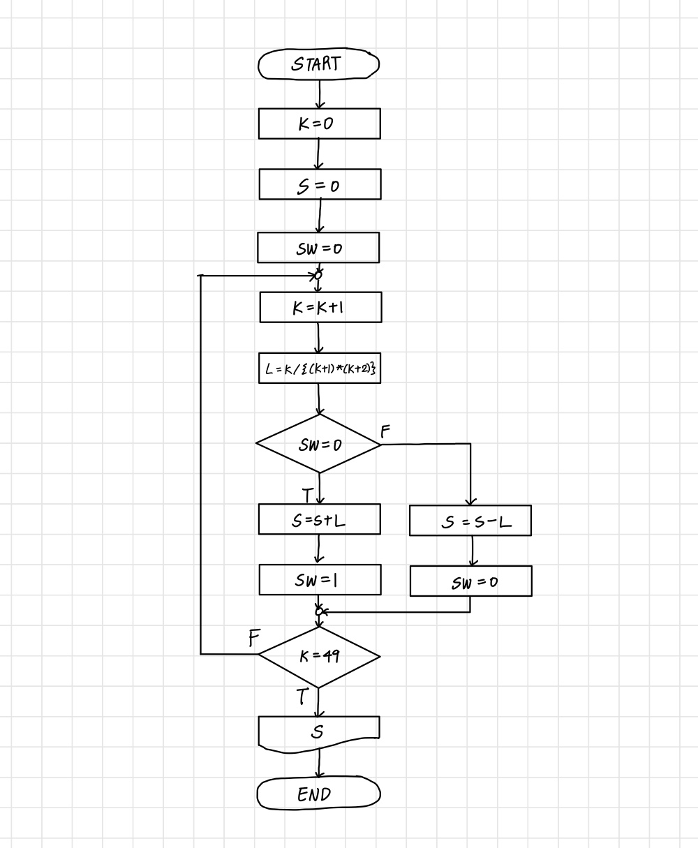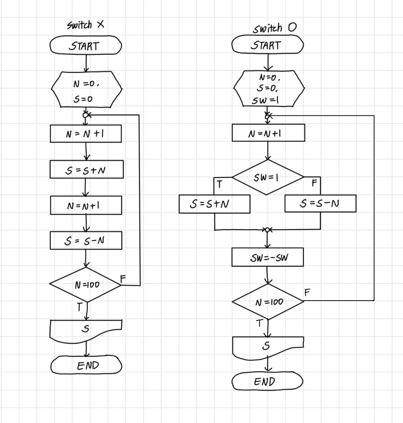문제) S=1-2+3-4+5-6+...-100의 값을 구하여 출력하는 알고리즘의 순서도