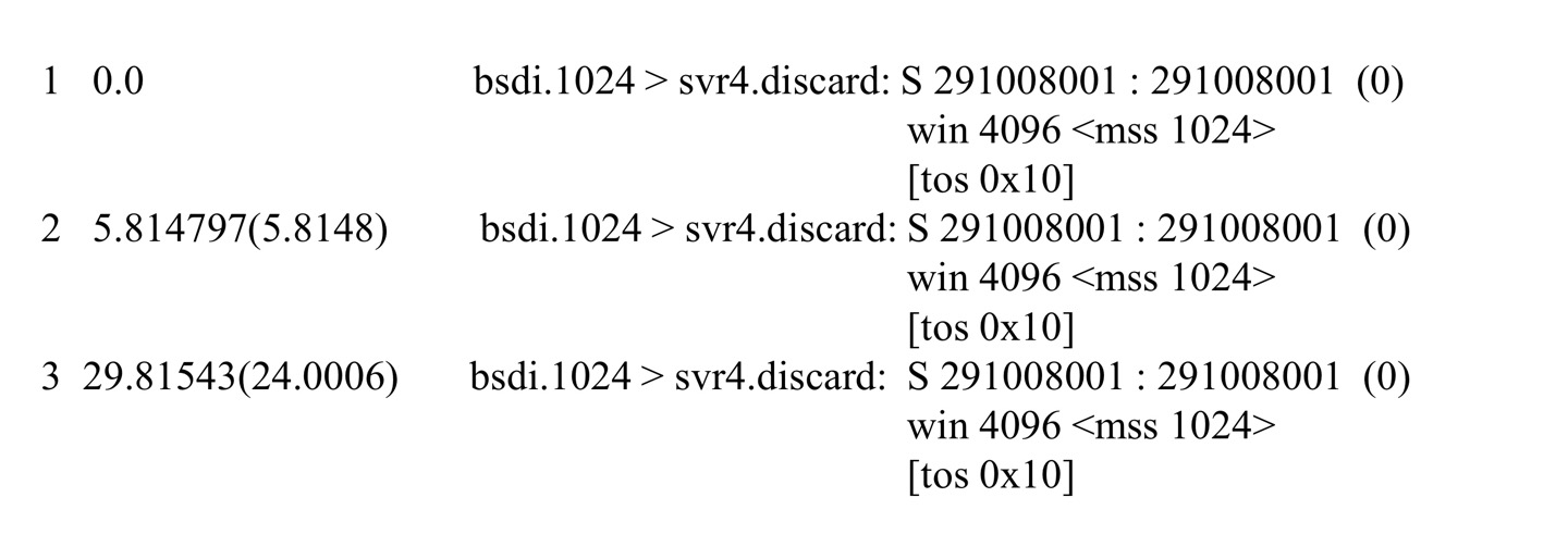- 클라이언트의 TCP가 연결을 설정하기 위해 SYN을 보냄 (첫번째 세그먼트 보낸 후 2번째 연결을 위한 시도 5.8초 후, 두번째 세그먼트를 보낸 후 3번째 연결을 위한 시도는 24초 후에 보냄)